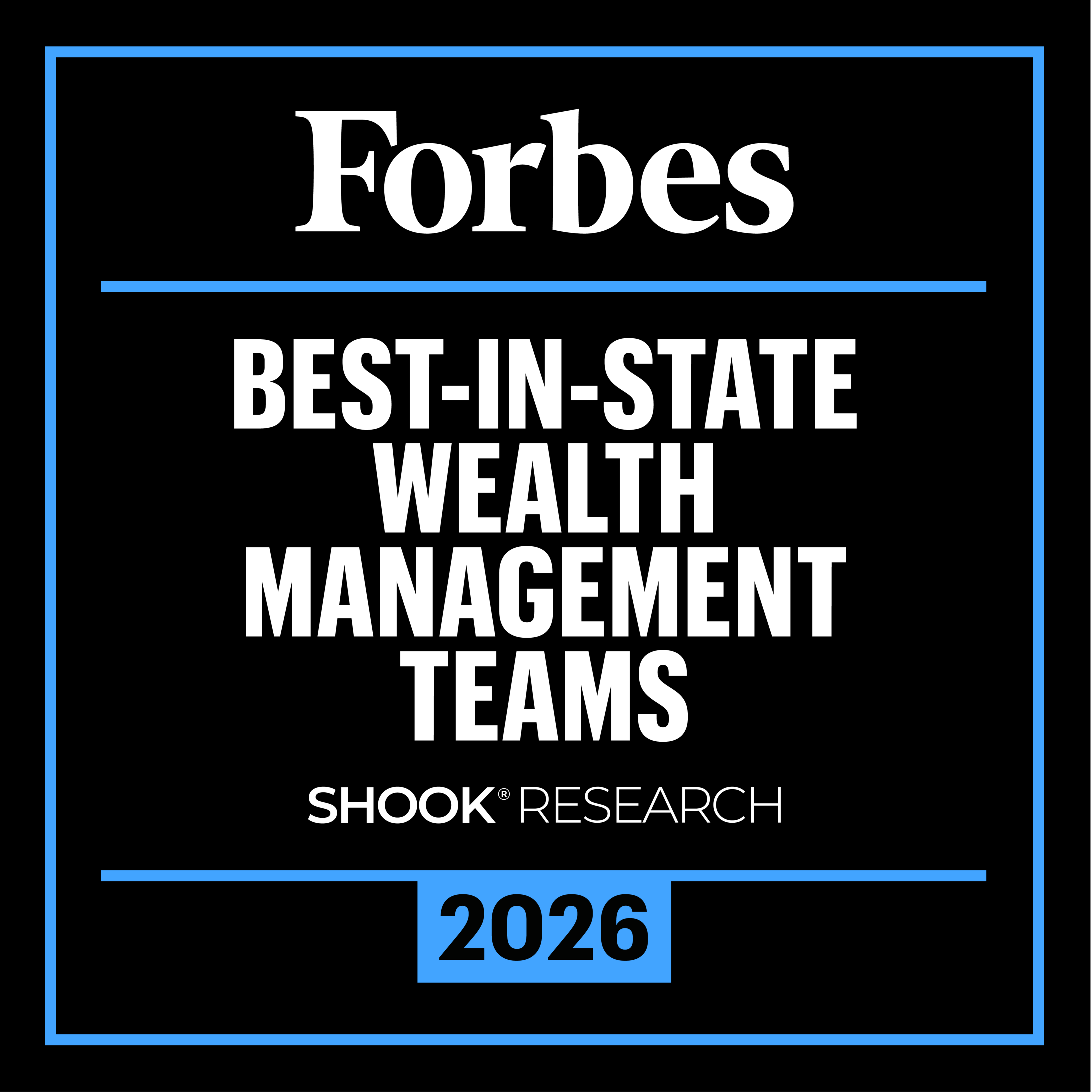 † The 2026 Forbes ranking of America’s Best-In-State Wealth Management Teams, developed by SHOOK Research, is based on an algorithm of qualitative criteria, mostly gained through telephone and in-person due diligence interviews, and quantitative data. This ranking is based upon the period from 3/31/2024 to 3/31/2025 and was released on 01/07/2026. Advisor teams that are considered must have one advisor with a minimum of seven years of experience, have been in existence as a team for at least one year, have at least 5 team members, and have been nominated by their firm. The algorithm weighs factors like revenue trends, assets under management, compliance records, industry experience and those that encompass best practices in their practices and approach to working with clients. Portfolio performance is not a criteria due to varying client objectives and lack of audited data. Out of approximately 12,787 team nominations, 6,149 advisor teams received the award based on thresholds. This ranking is not indicative of an advisor's future performance, is not an endorsement, and may not be representative of individual clients' experience. Neither Raymond James nor any of its Financial Advisors or RIA firms pay a fee in exchange for this award/rating. Compensation provided for using the rating. Raymond James is not affiliated with Forbes or Shook Research, LLC. Please see https://www.forbes.com/lists/wealth-management-teams-best-in-state for more info.